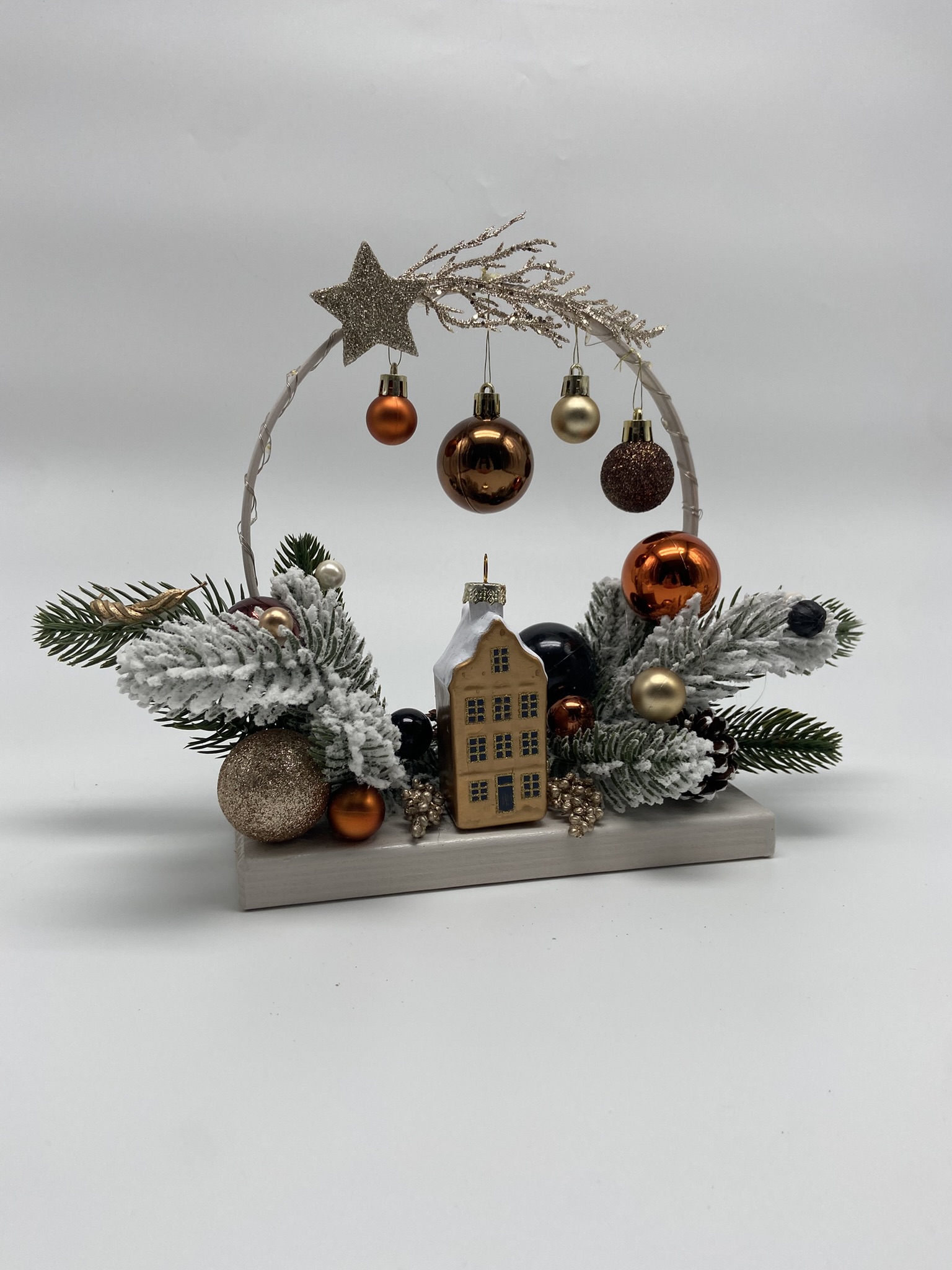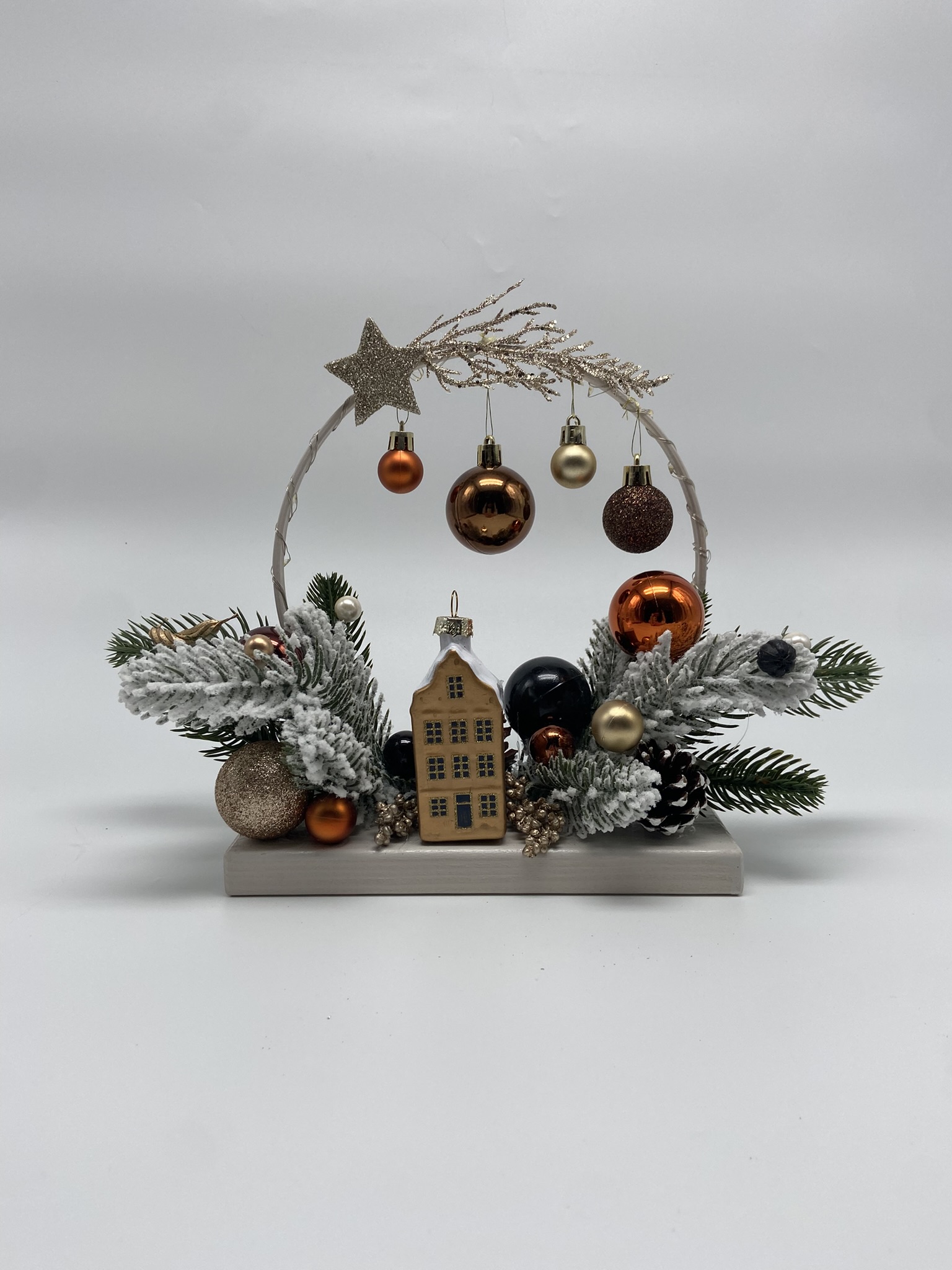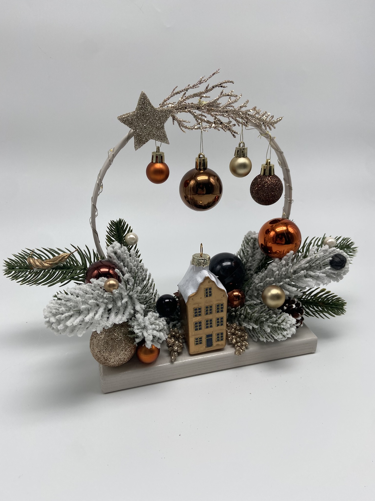 Aranjament decorativ de Crăciun pe suport din lemn, în format cerc, potrivit pentru expunere pe suprafețe precum birou, comodă, consolă, etajeră sau pervaz. Baza este dreptunghiulară (20 × 10 cm), iar semicercul din lemn, cu diametrul de 19 cm, este vopsit cu vopsea pe bază de apă în nuanțe moderne — gri nordic, alb nordic, alb murdar, verde agave sau crem cald.