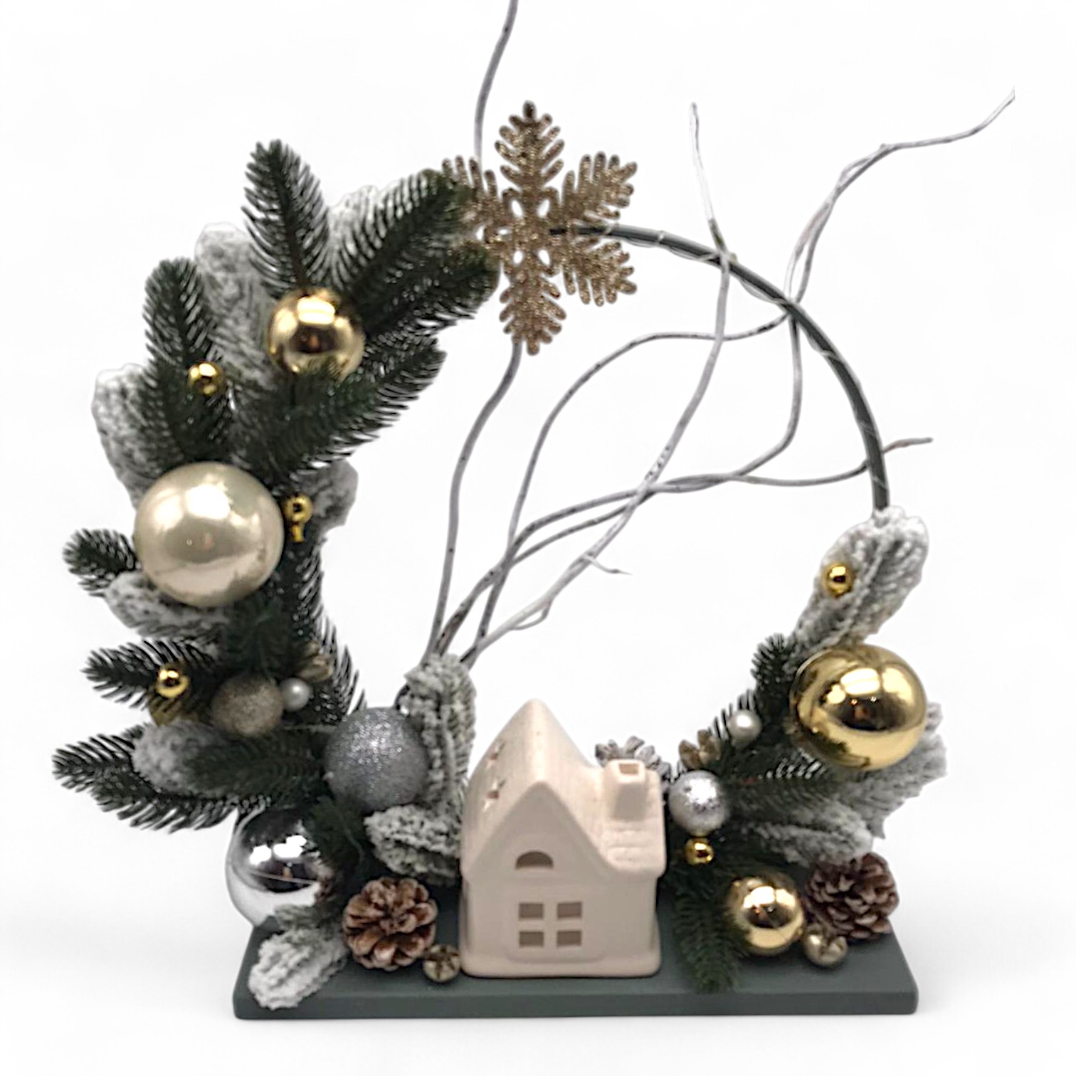 Aranjament decorativ tip cerc, Ø 22 cm, pe suport din lemn. Figurină „casuta nude”, crenguțe artificiale simple și ninse, elemente decorative alese cu grijă și lumină LED (baterii incluse). Potrivit pentru birou, comodă, consolă, etajeră sau pervaz. Realizat manual in atelierul nostru din Sibiu.