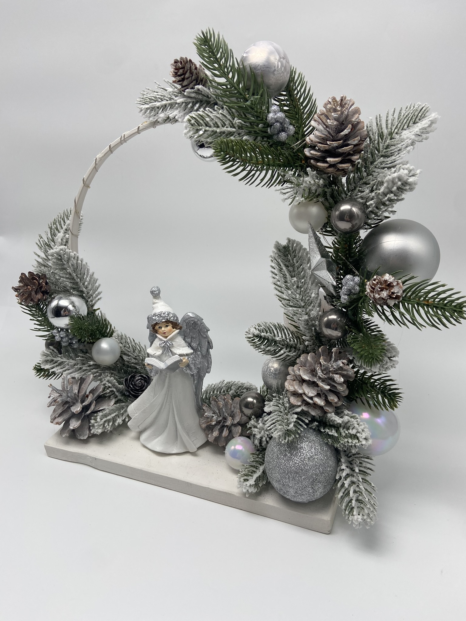 Aranjament decorativ de Crăciun pe suport din lemn, în format cerc, potrivit pentru expunere pe suprafețe precum birou, comodă, consolă, etajeră sau pervaz. Baza este dreptunghiulară (30 × 10 cm), iar semicercul din lemn, cu diametrul de 30 cm, este vopsit cu vopsea pe bază de apă în nuanțe moderne — gri nordic, alb nordic, alb murdar, verde agave sau crem cald.