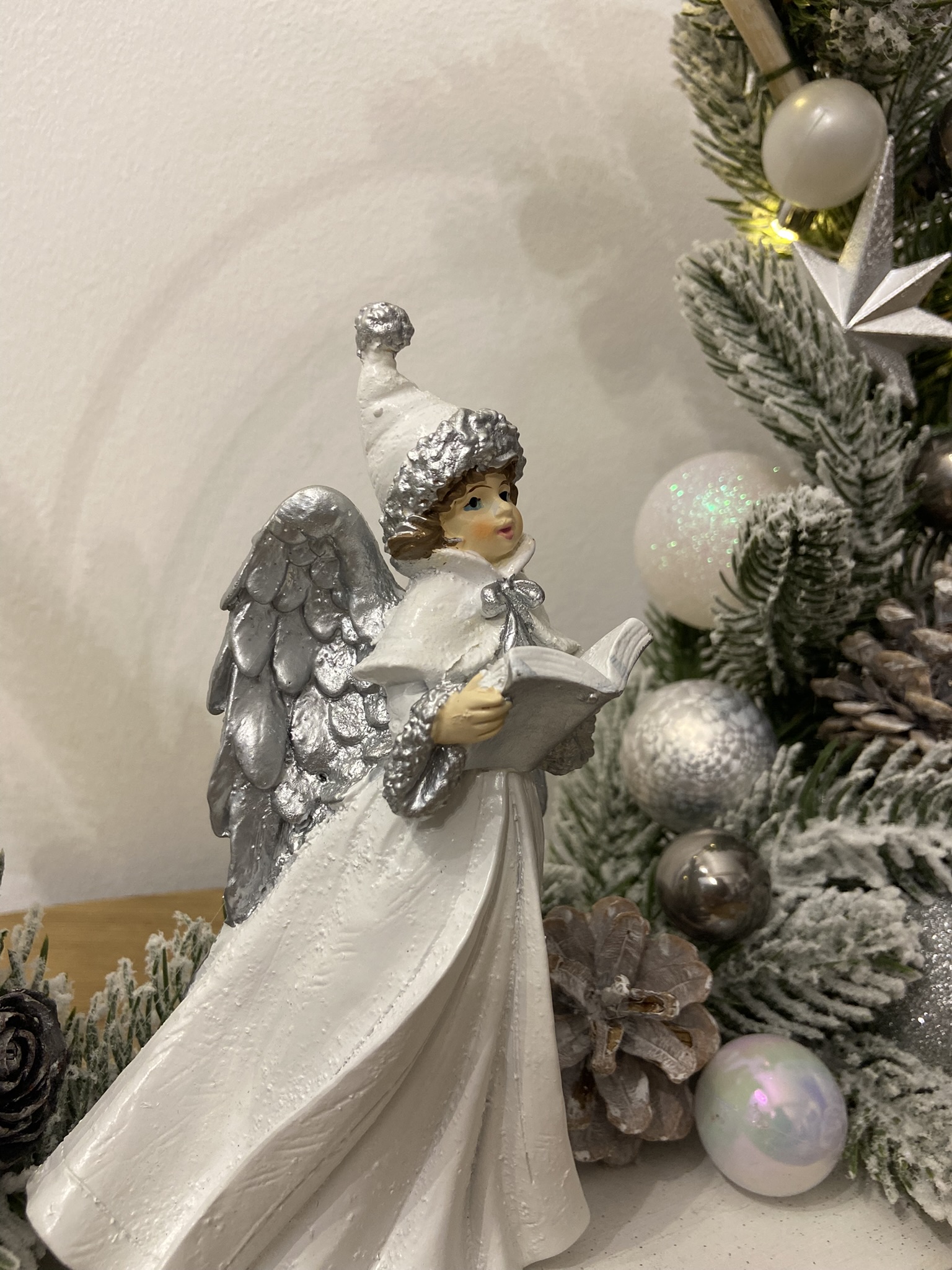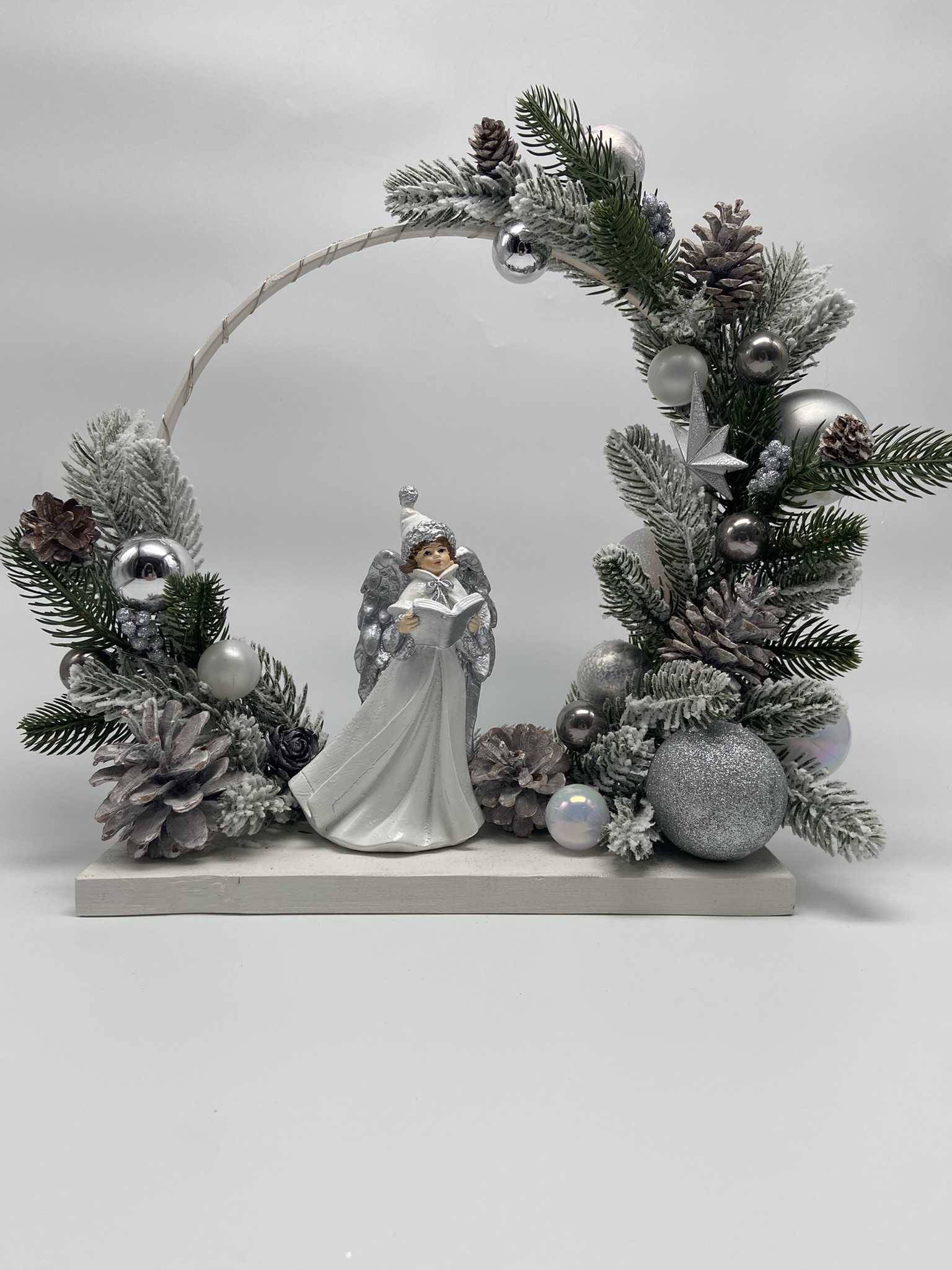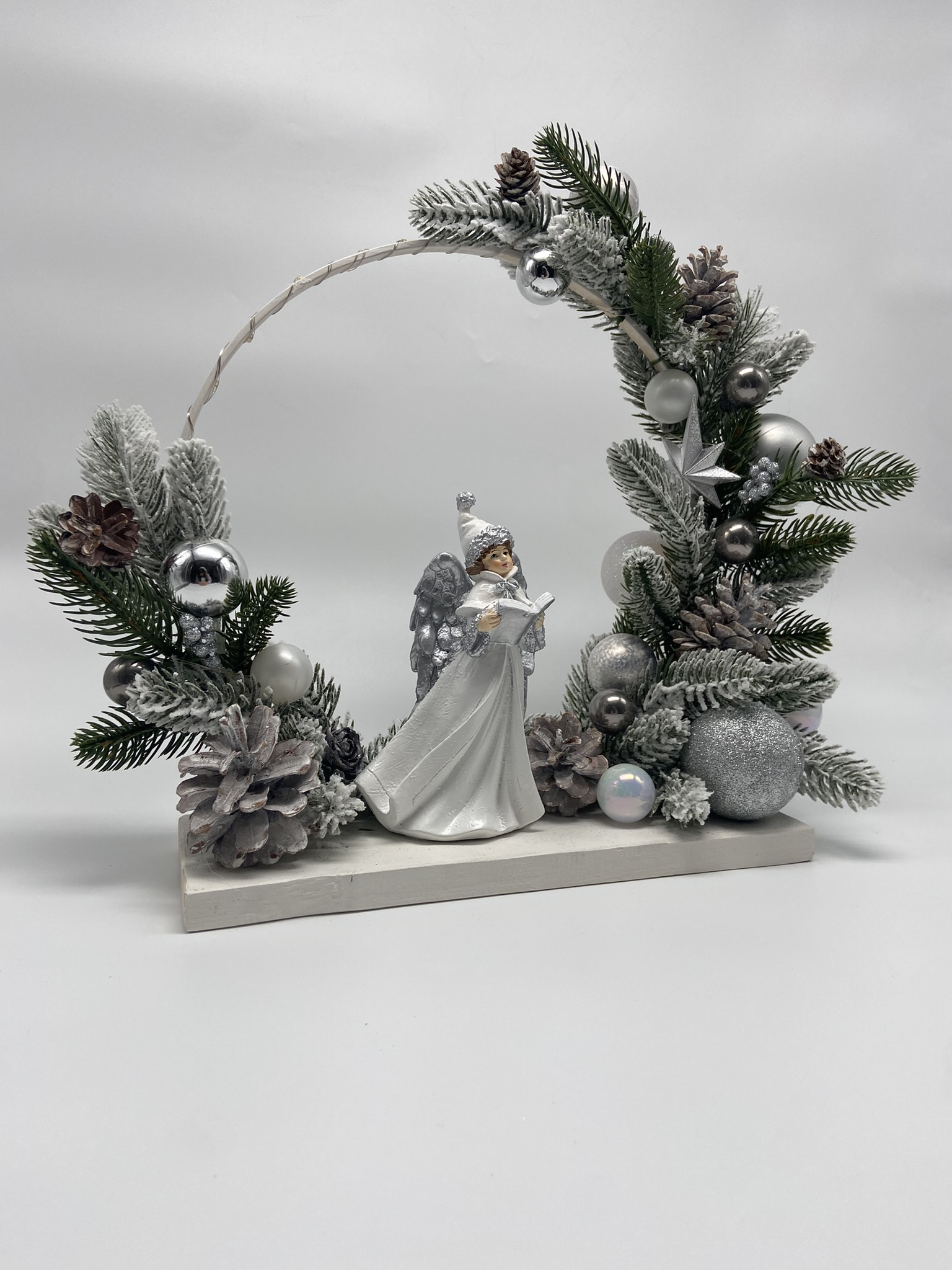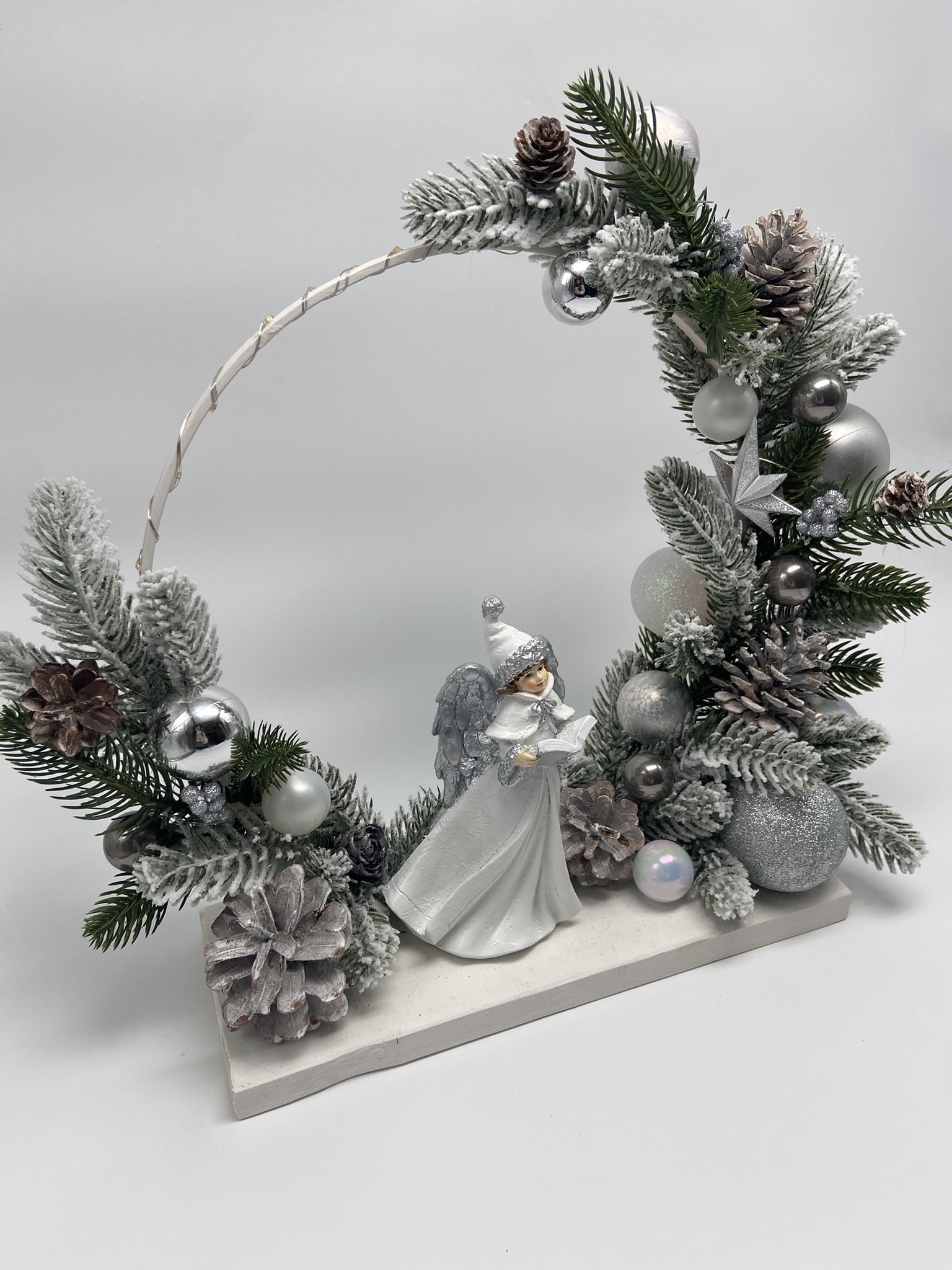 Aranjament decorativ tip cerc, Ø 22 cm, pe suport din lemn. Figurină „inger”, crenguțe artificiale simple și ninse, elemente decorative alese cu grijă și lumină LED (baterii incluse). Potrivit pentru birou, comodă, consolă, etajeră sau pervaz. Realizat manual in atelierul nostru din Sibiu.