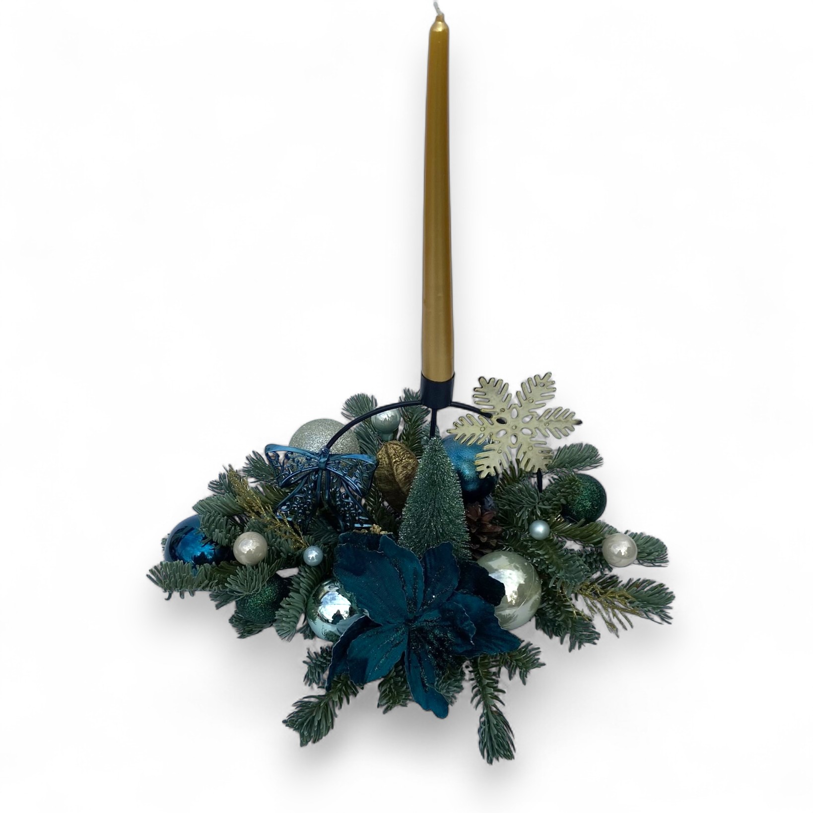 Aranjament decorativ de Craciun in nuante elegante de albastru inchis si auriu. Modelul imbina crengute artificiale ninse, globuri aurii, flori decorative albastre, accente stralucitoare si elemente naturale atent selectate. Lumanarea decorativa din centru (fara flacara reala) aduce echilibru si caldura vizuala, ceea ce face aranjamentul potrivit atat pentru masa de Craciun, cat si pentru o consola, etajera sau pervaz.