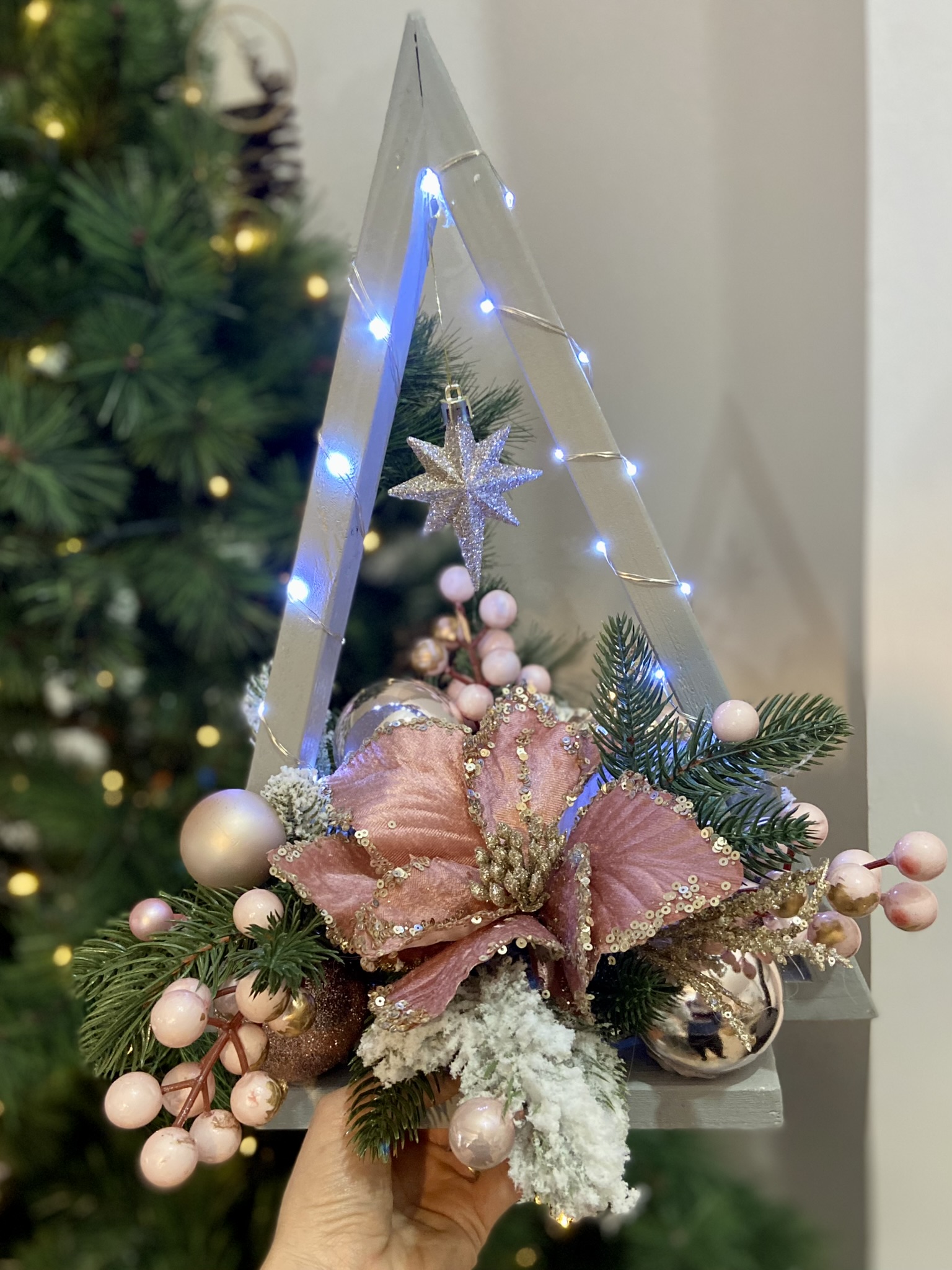 Aranjament de Craciun in forma de triunghi, cu LED integrat pe structura si decor roz-auriu cu floare centrala. Baza din lemn realizata manual, potrivit pentru masa, consola sau etajera.