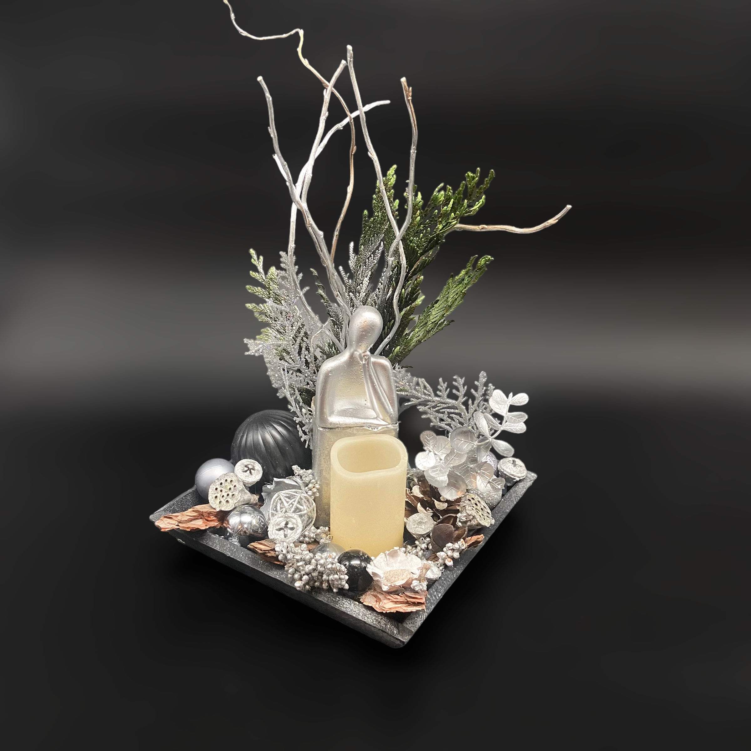 Aranjament de masa realizat pe o tava neagra de lemn cu elemente decorative de Craciun precum crengi straluctiroare si globuri si elemente naturale precum bradul stabilizat (care nu se usuca si rezista de la un an la altul), conuri, scoarta, floare de cedru, frunze si crengi de salcie. Lumanarea din aranjament este electrica si functioneaza pe baza de baterii.