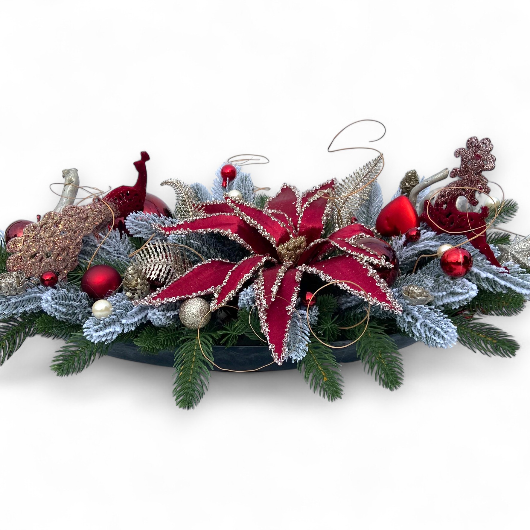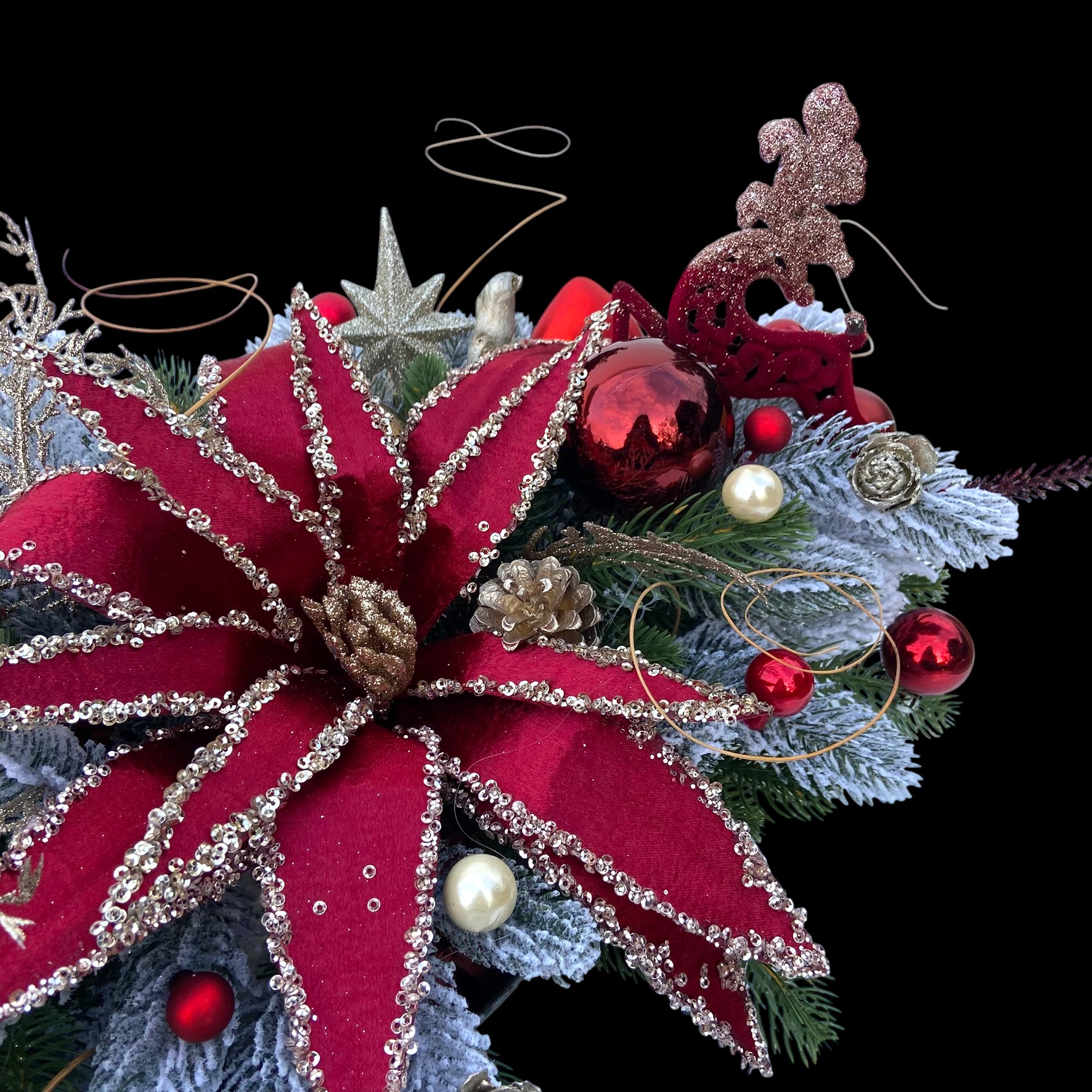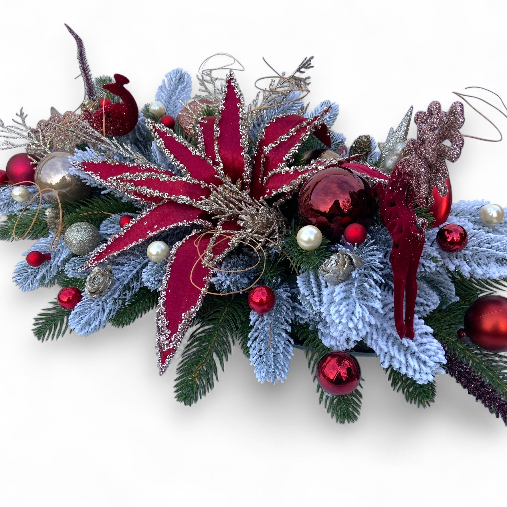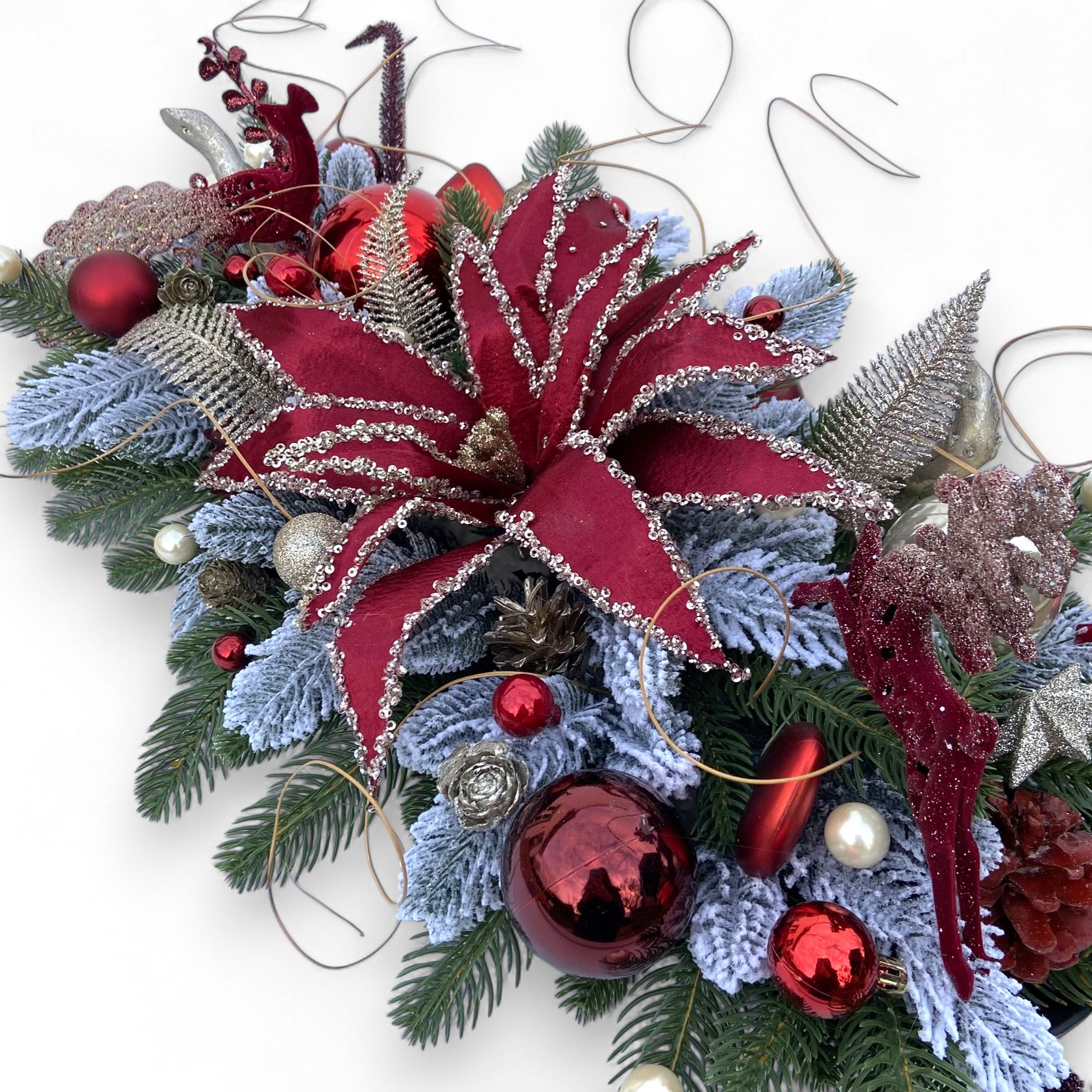 Aranjament de Crăciun realizat cu globuri, ornamente de craciun, figurine elegante si elemente naturale. Perfect pentru a aduce în casă atmosfera sărbătorilor, acest aranjament oferă un impact vizual elegant și este ideal pentru a fi pus pe masa de Crăciun . Potrivit pentru cadou sau pentru completarea decorului de iarnă, fiind creat cu atenție la detalii și materiale de calitate.