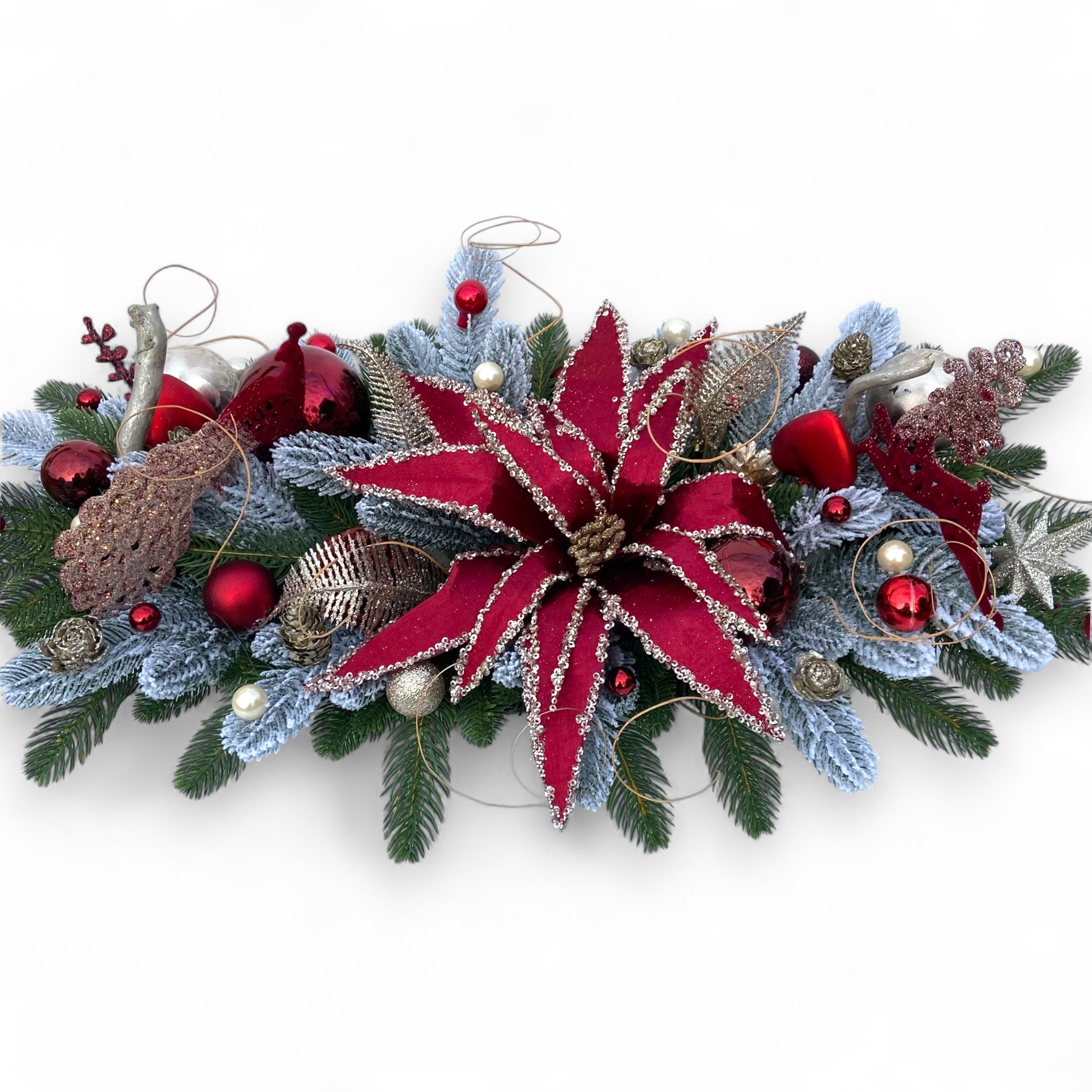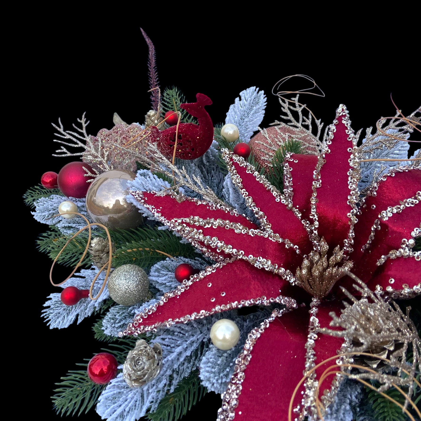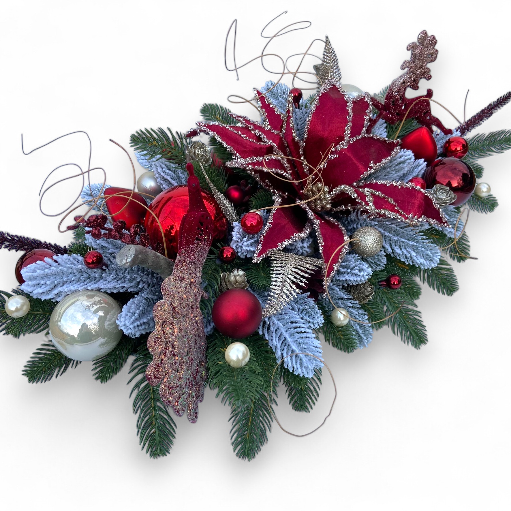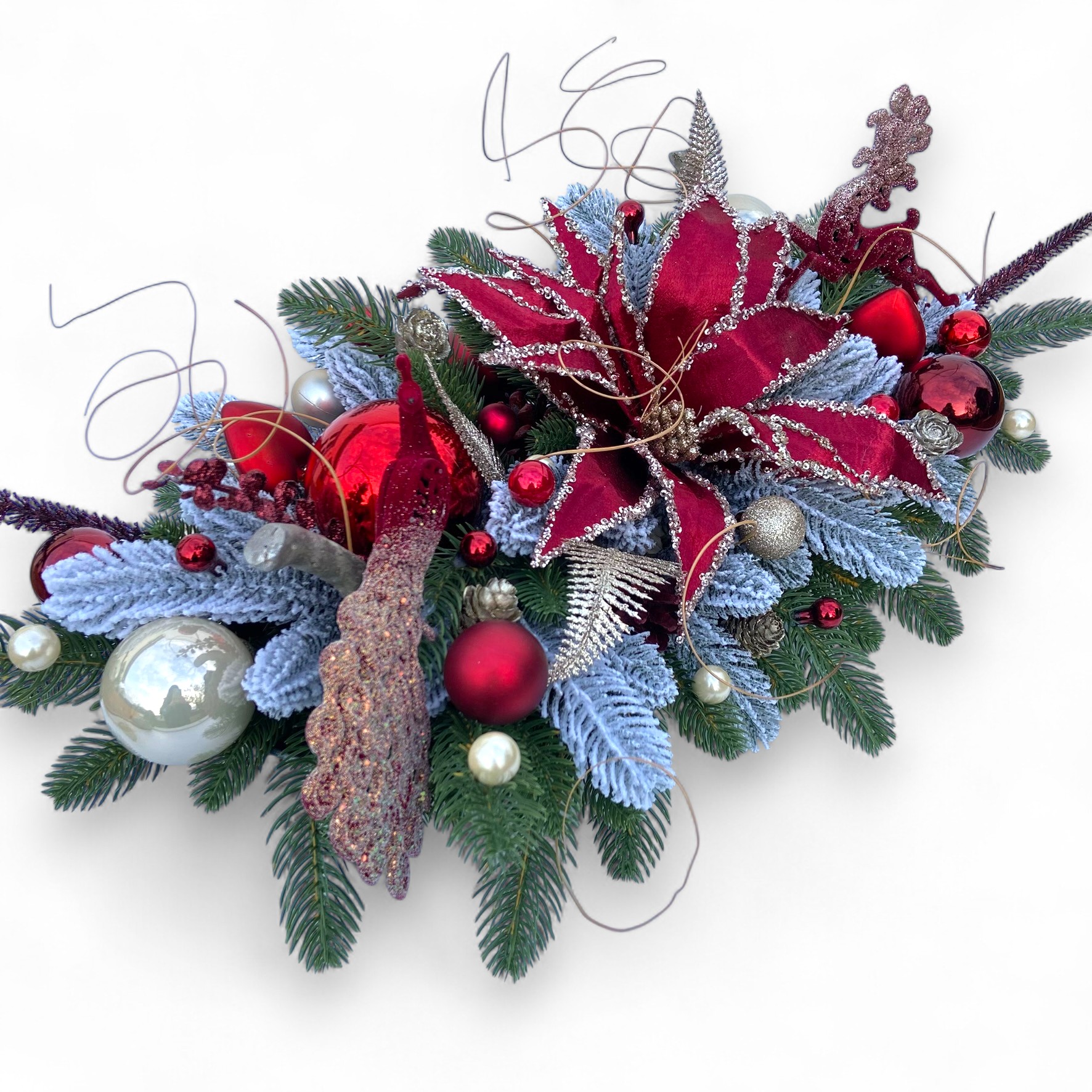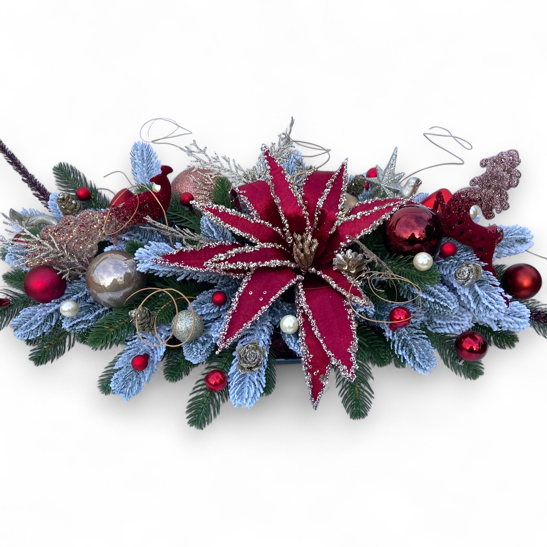 Aranjament de Crăciun realizat cu globuri, ornamente de craciun, figurine elegante si elemente naturale. Perfect pentru a aduce în casă atmosfera sărbătorilor, acest aranjament oferă un impact vizual elegant și este ideal pentru a fi pus pe masa de Crăciun . Potrivit pentru cadou sau pentru completarea decorului de iarnă, fiind creat cu atenție la detalii și materiale de calitate.