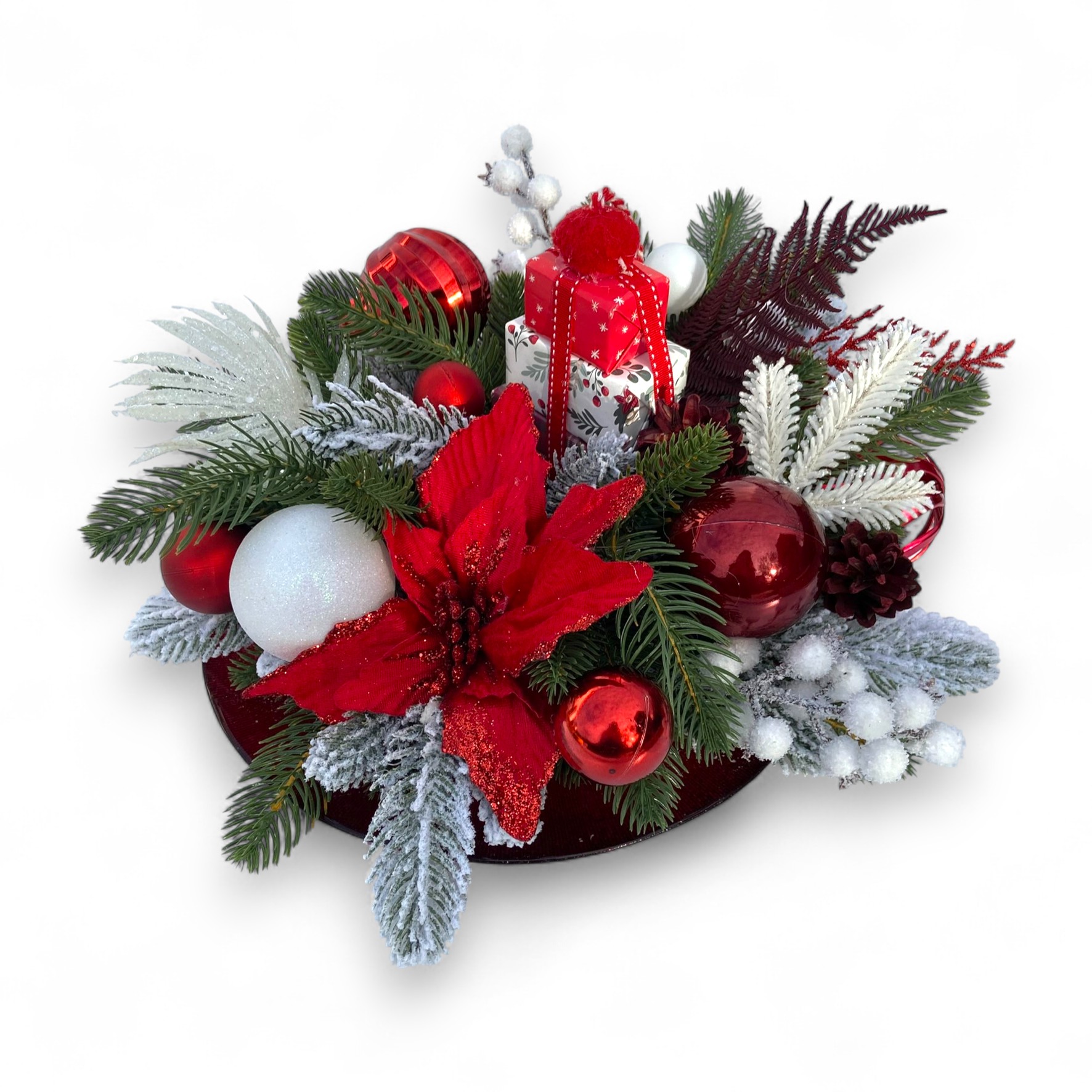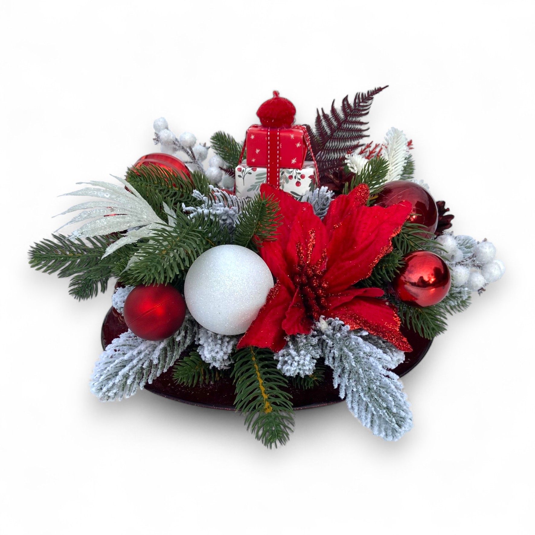 Aranjament de Crăciun premium realizat cu globuri, ornamente de craciun, figurine elegante si elemente naturale. Perfect pentru a aduce în casă atmosfera sărbătorilor, acest aranjament oferă un impact vizual elegant și este ideal pentru a fi pus pe masa de Crăciun . Potrivit pentru cadou sau pentru completarea decorului de iarnă, fiind creat cu atenție la detalii și materiale de calitate.