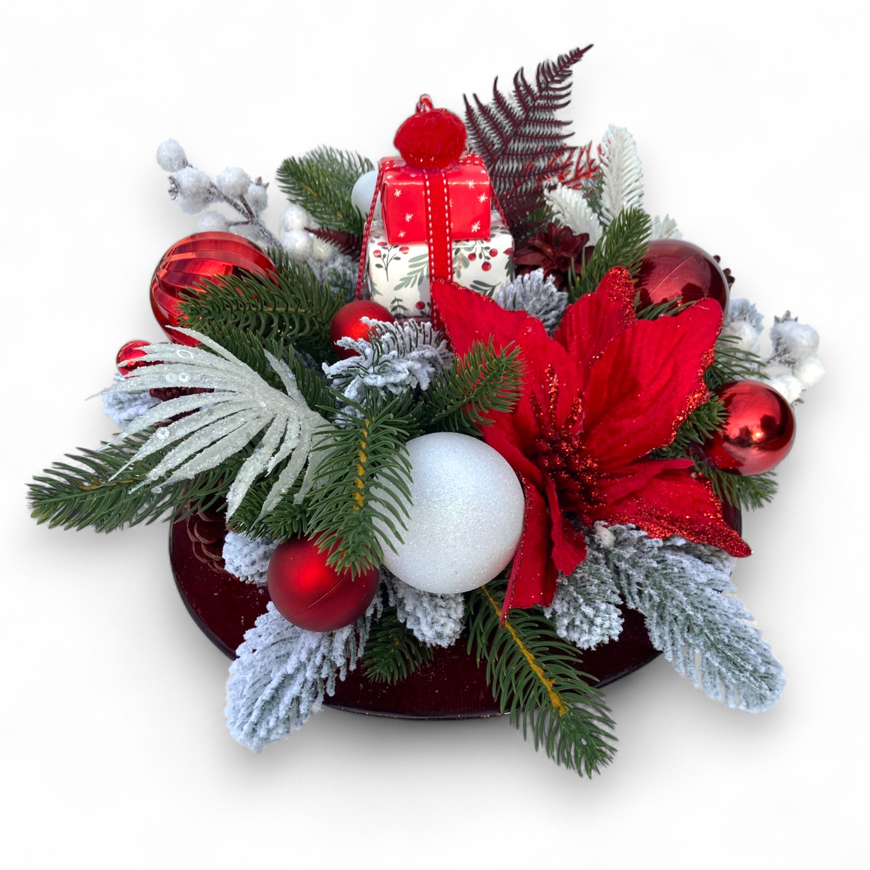 Aranjament de Crăciun realizat cu globuri, ornamente de craciun, figurine elegante si elemente naturale. Perfect pentru a aduce în casă atmosfera sărbătorilor, acest aranjament oferă un impact vizual elegant și este ideal pentru a fi pus pe masa de Crăciun . Potrivit pentru cadou sau pentru completarea decorului de iarnă, fiind creat cu atenție la detalii și materiale de calitate.