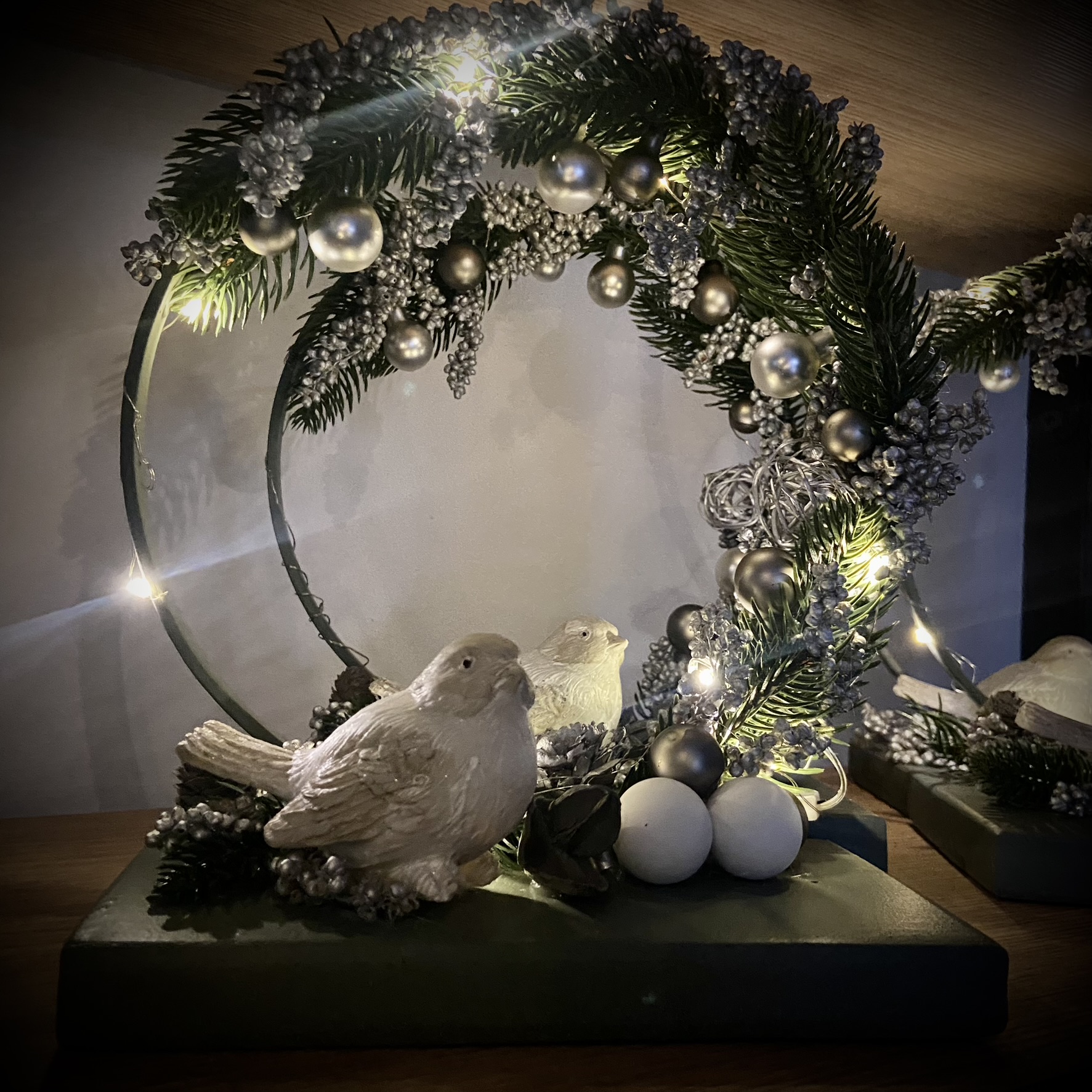 Aranjament decorativ tip cerc, Ø 22 cm, pe suport din lemn. Figurină „vrabiuta”, crenguțe artificiale simple și ninse, elemente decorative alese cu grijă și lumină LED (baterii incluse). Potrivit pentru birou, comodă, consolă, etajeră sau pervaz. Realizat manual in atelierul nostru din Sibiu.