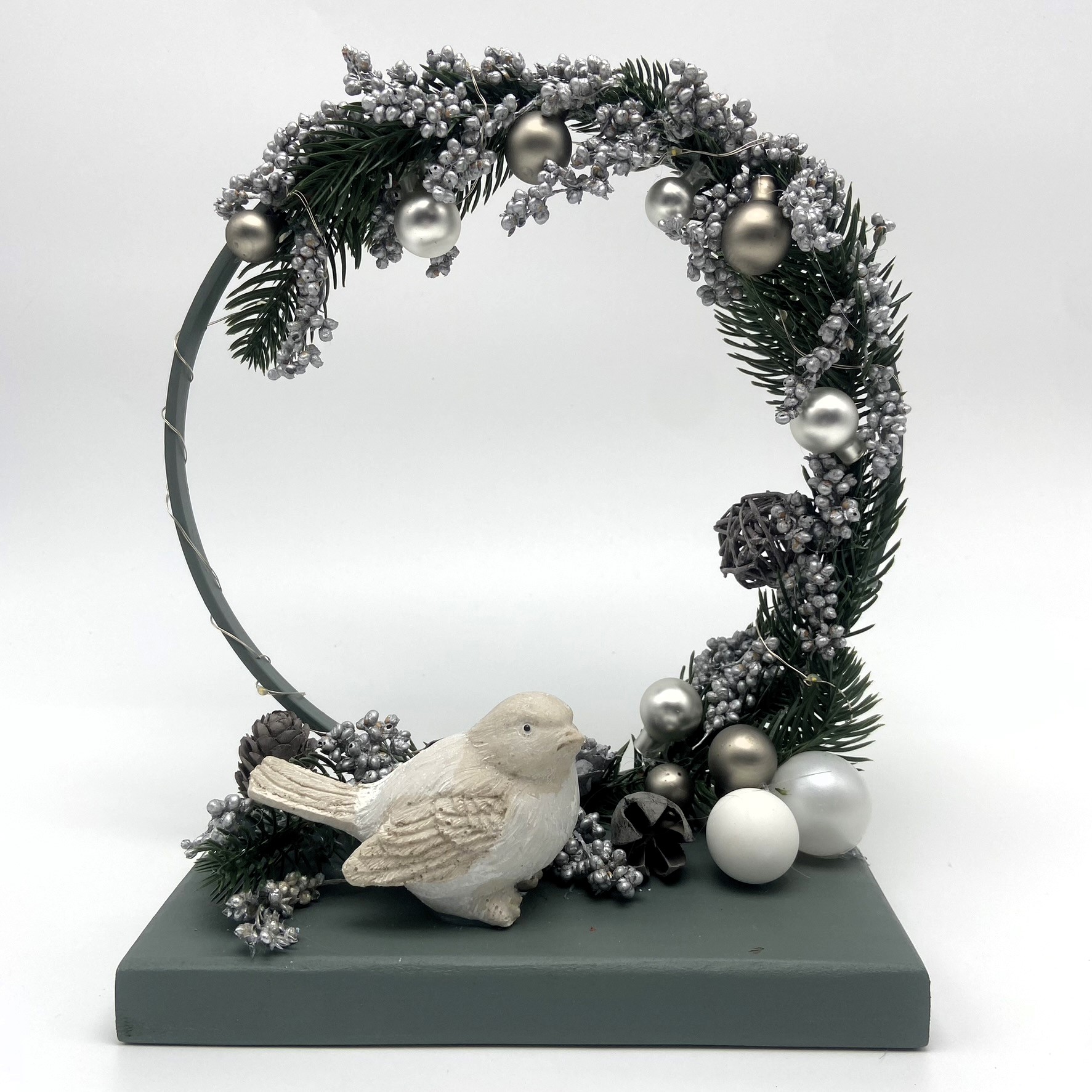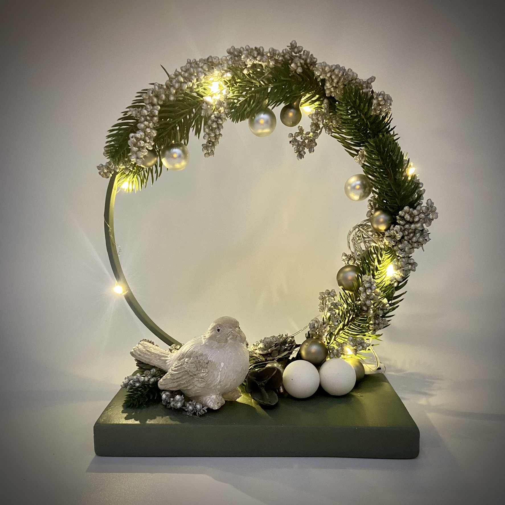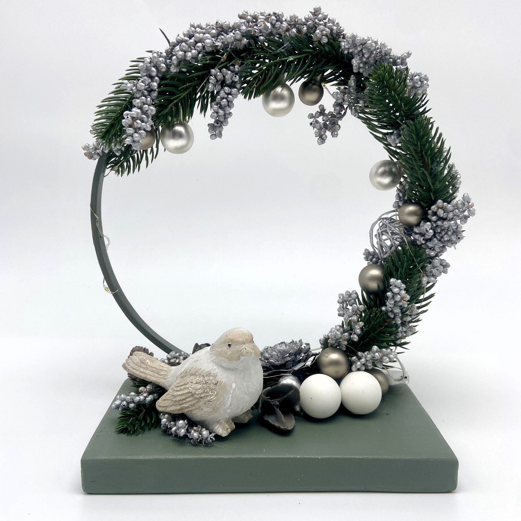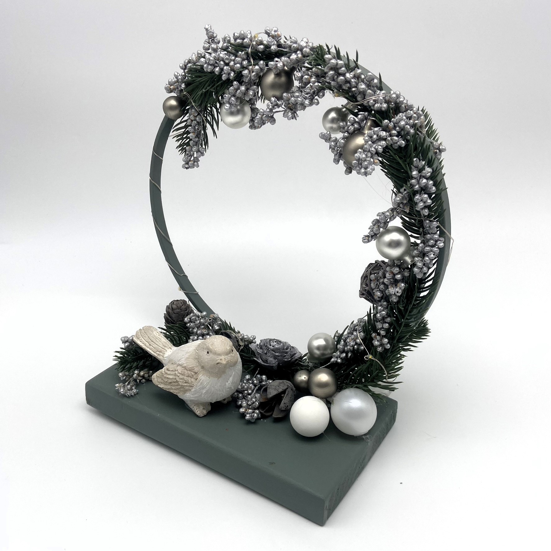 Aranjament decorativ de Crăciun pe suport din lemn, în format cerc, potrivit pentru expunere pe suprafețe precum birou, comodă, consolă, etajeră sau pervaz. Baza este dreptunghiulară (20 × 10 cm), iar semicercul din lemn, cu diametrul de 22 cm, este vopsit cu vopsea pe bază de apă în nuanțe moderne — gri nordic, alb nordic, alb murdar, verde agave sau crem cald.