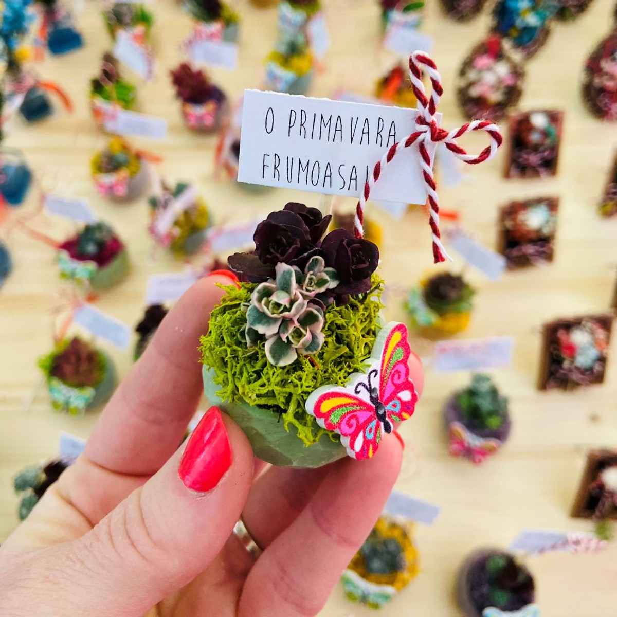 Acest mărțișor cu suculente este realizat sub forma unui mini ghiveci decorativ, în care sunt plantate suculente naturale crescute în sera noastră. Plantele sunt alese în funcție de disponibilitatea din perioada respectivă, fiecare mărțișor având un aspect ușor diferit, specific plantelor naturale.