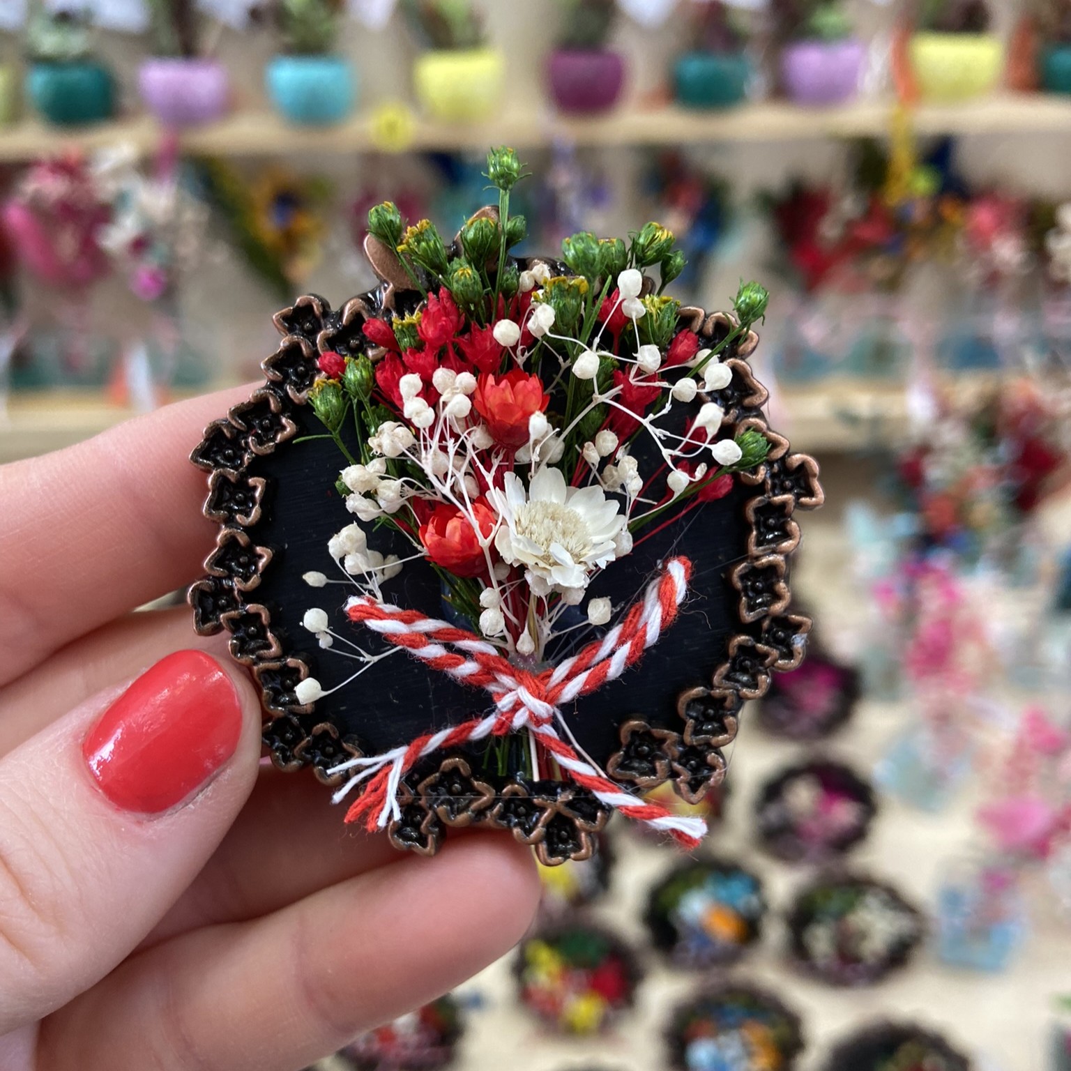 Florile folosite sunt naturale, uscate sau stabilizate, alese pentru a-și păstra aspectul fără a necesita îngrijire specială. Fiecare ramă florală este realizată manual, astfel încât pot exista mici variații de culoare sau compoziție, ceea ce face ca fiecare mărțișor să fie unic.