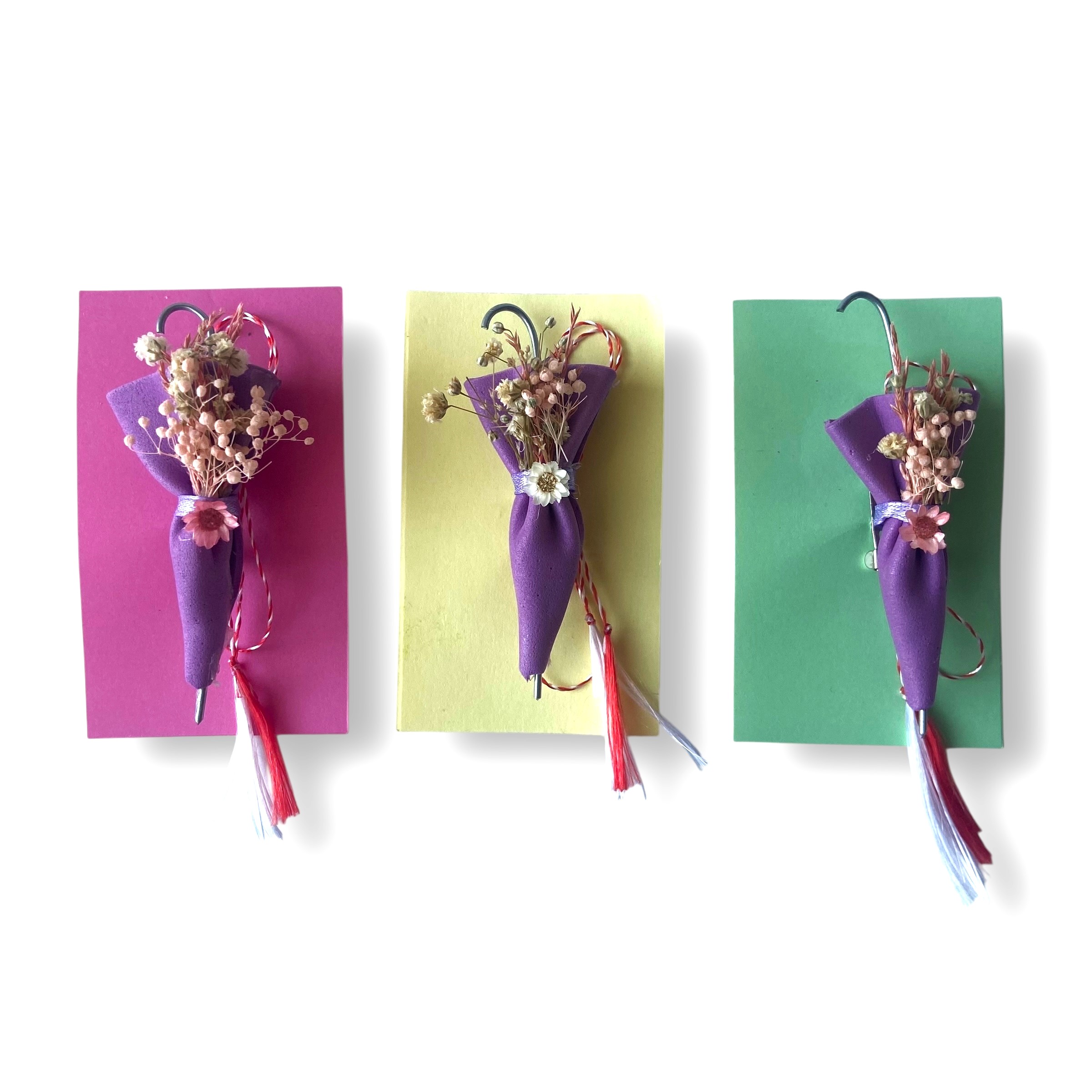 Acest mărțișor tip broșă este realizat manual de noi sub forma unei umbreluțe miniaturale, cu baza creată integral manual și decorată cu flori uscate atent alese. Forma de umbreluță adaugă un aer jucăuș și expresiv mărțișorului, transformându-l într-un accesoriu mic, dar plin de personalitate.